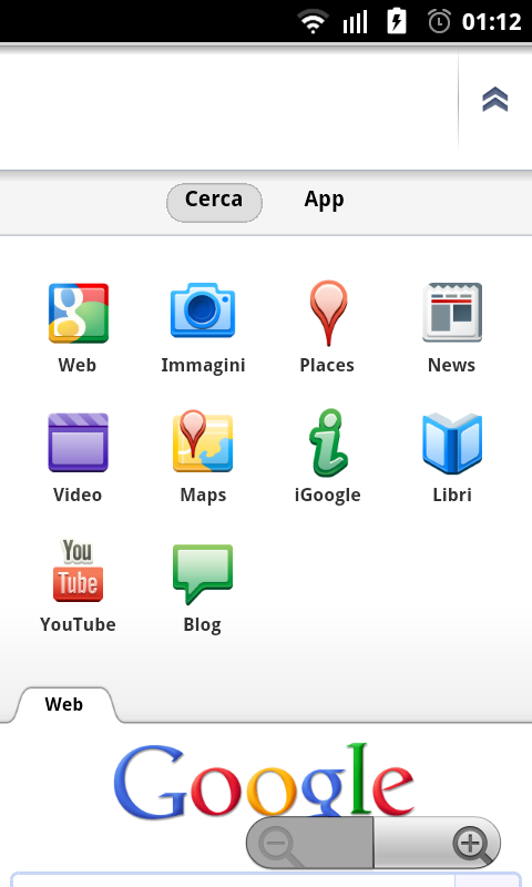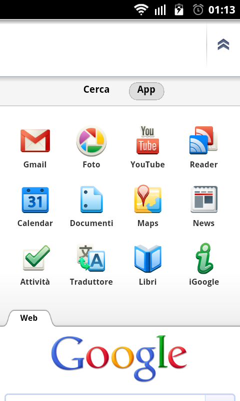 Il pulsante Cerca mostra le icone suddette, invece cliccando su App verranno visualizzate le icone delle applicazioni Google: Gmail, Foto, Reader, Calendar, Documenti, Maps, Traduttore, etc…